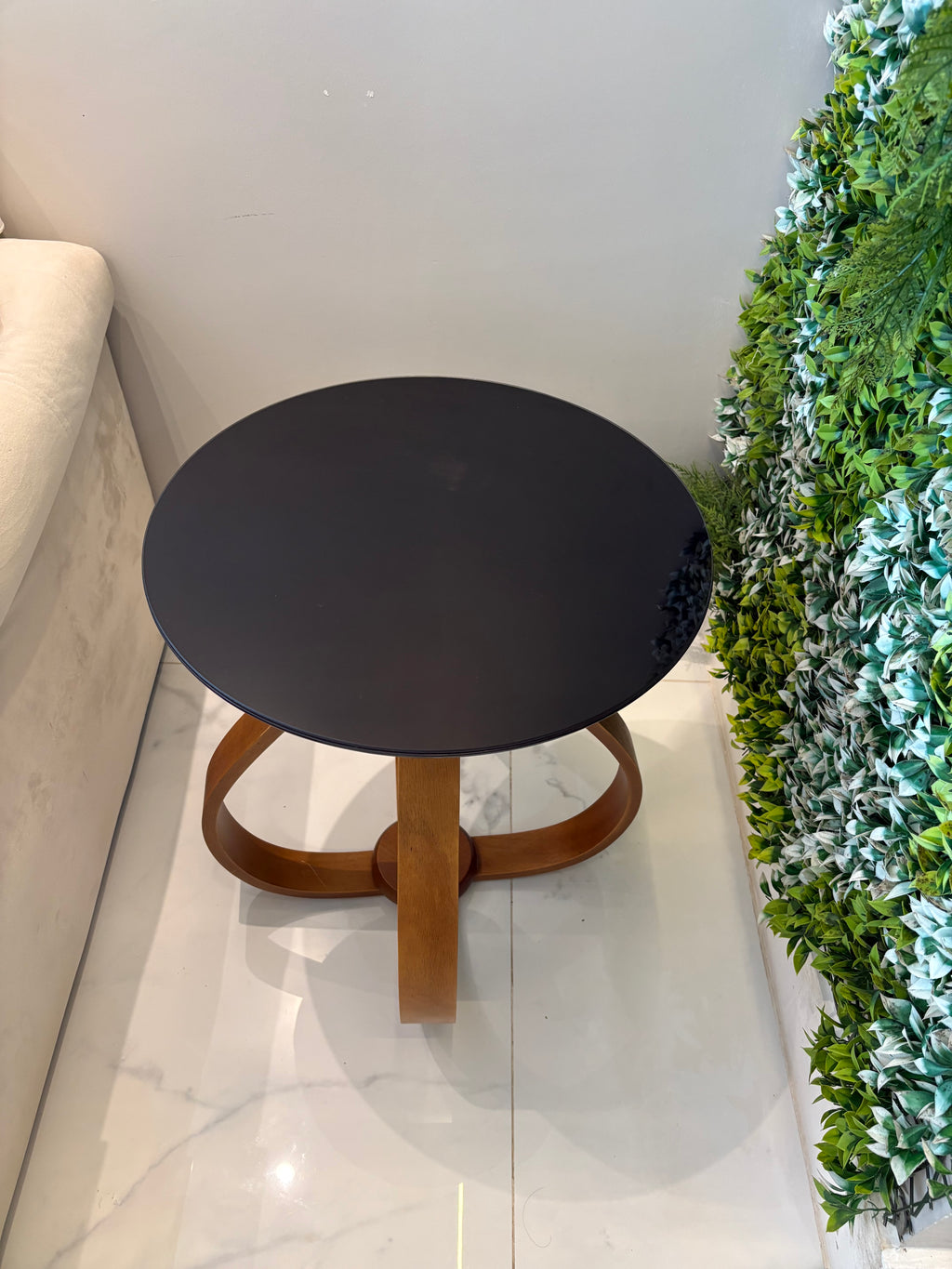 Esta Mesa Lateral oferece uma solução elegante e funcional, possui pé em madeira revestida na cor castanho, confere resistência e acabamento refinado.